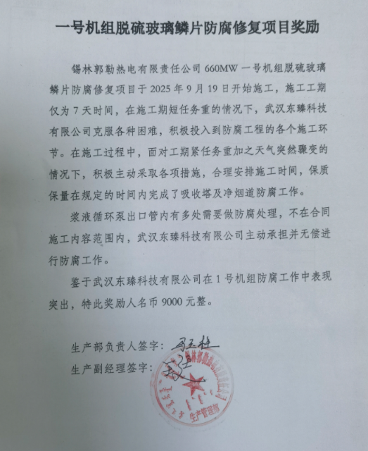 近日,锡林郭勒热电有限责任公司660MW一号机组脱硫玻璃鳞片防腐修复项目圆满落幕,施工方武汉东臻科技有限公司凭借出色的施工表现、高效的执行能力与主动担当的企业精神,赢得了业主单位的高度认可与正式嘉奖,获颁人民币 9000元奖励。